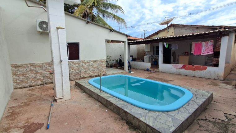 Casa com 3/4 sendo uma suíte, sala, cozinha, 01 wc social, varanda, área de serviço, piscina, murada com portão.